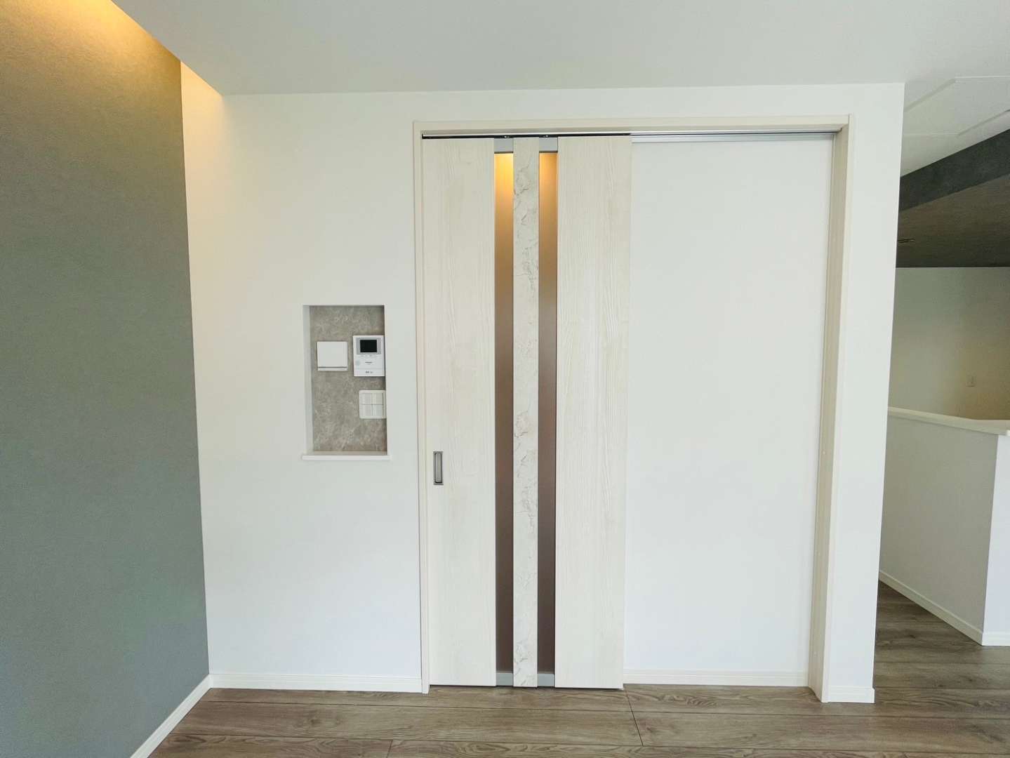 グレーのドアが空間に上質なモダンさを添え、 グリーンのアクセントクロスが自然のやさしさを演出。 視覚的な心地よさと機能性を兼ね備えたデザ…
